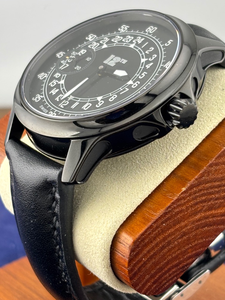 The 45 mm black PVD coated 316L stainless steel case is Swiss made and features impeccable Swiss precision and sapphire crystal and exhibition case back. The strap is made of exquisitely comfortable Spanish leather with a Breitling style deployment clasp.